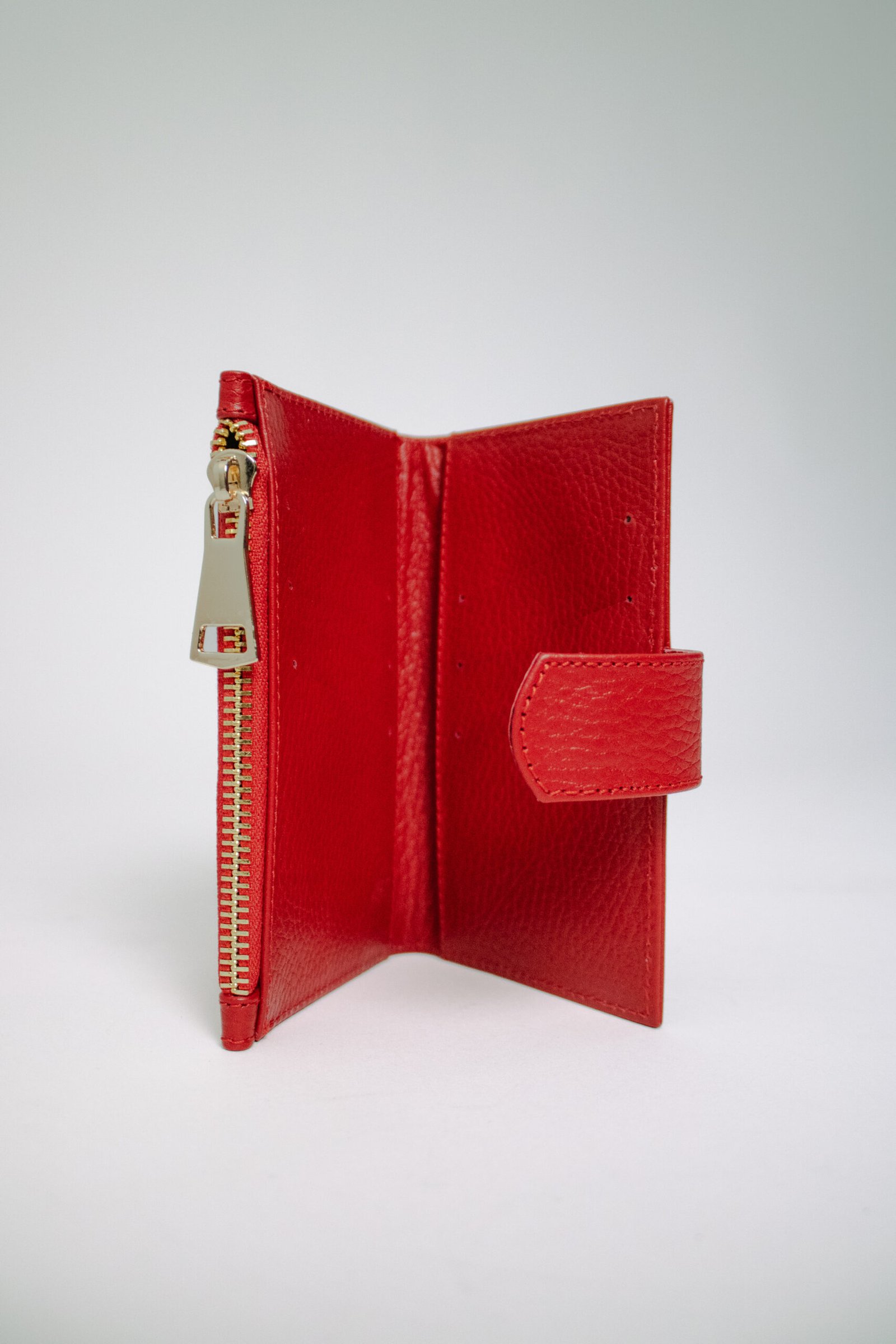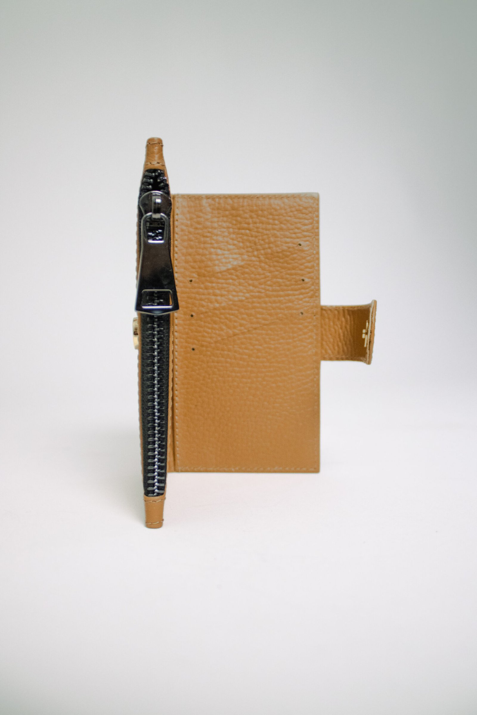 Cartera funcional y minimalista con cierre. Posee seis ranuras para tarjetas y un compartimento central con zipper para monedas. Un diseño sofisticado con zipper dorado, jalador de pompón e interior íntegramente en piel.