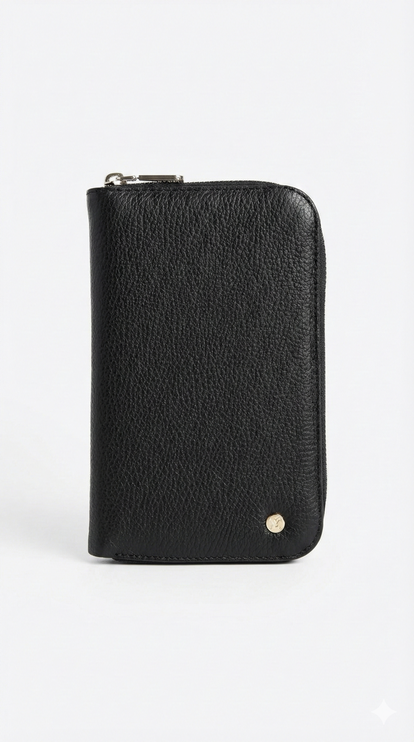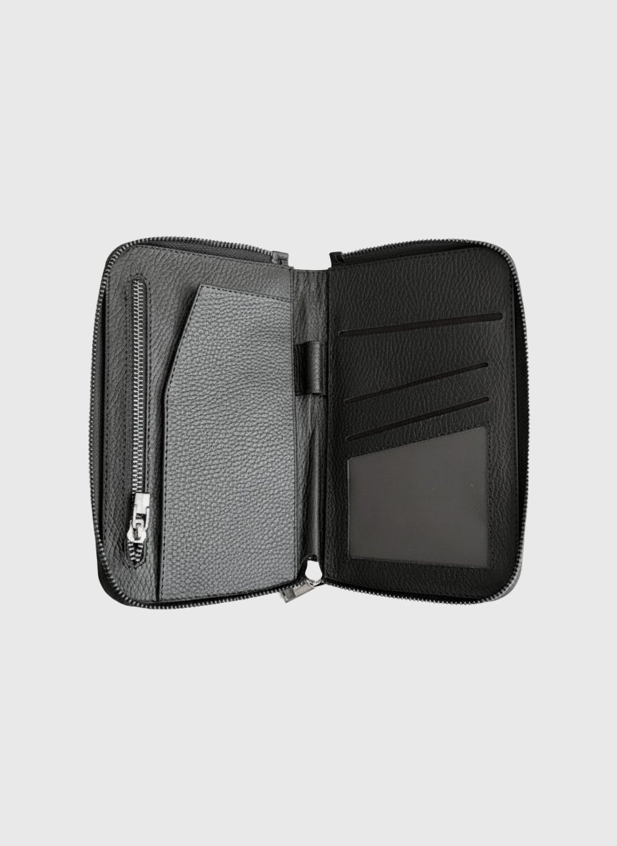 Porta pasaporte individual con cierre perimetral de zipper metálico en acabado pavón. Su interior está diseñado para la organización total: cuenta con dos espacios para tarjetas, ventana transparente, portaplumas, compartimento para pase de abordar y documentos, además de un práctico zipper interior.